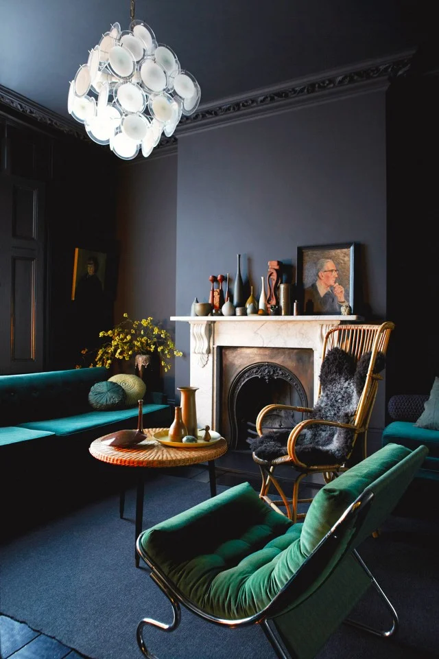 The above, now iconic, dark interior by Graham Atkins-Hughes shows how beautifully the blues, greens and greys meld together. Particularly impressive is the bravery on embracing the dark side by painting the cornice moulding, ceiling walls and floors in the same deep dark colour which leaves the fireplace and statement lighting to really talk for itself.